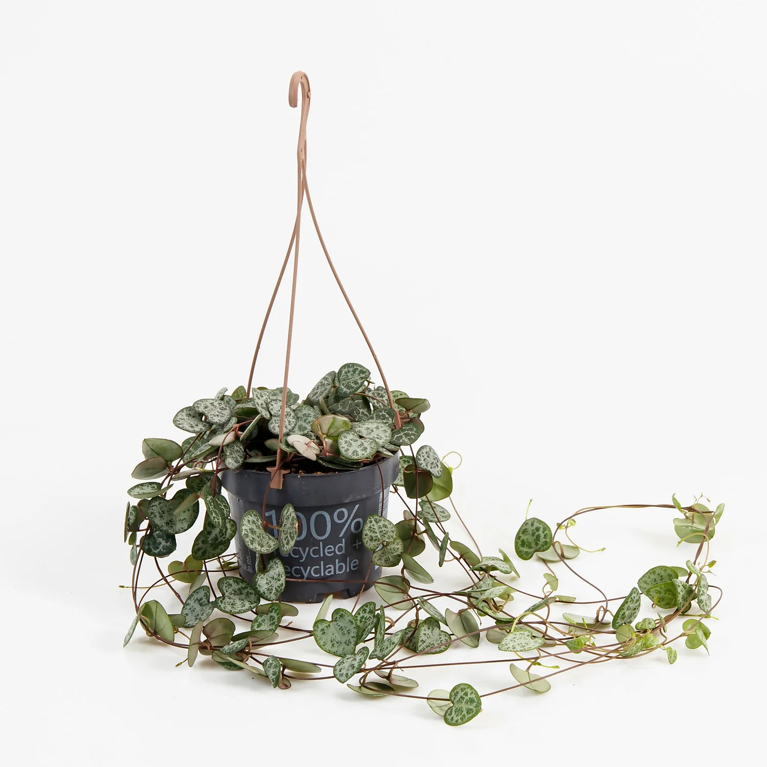 The Ceropegia Woodii (String of Hearts) has beautiful, delicate, heart-shaped green, cream and pink spotted leaves.