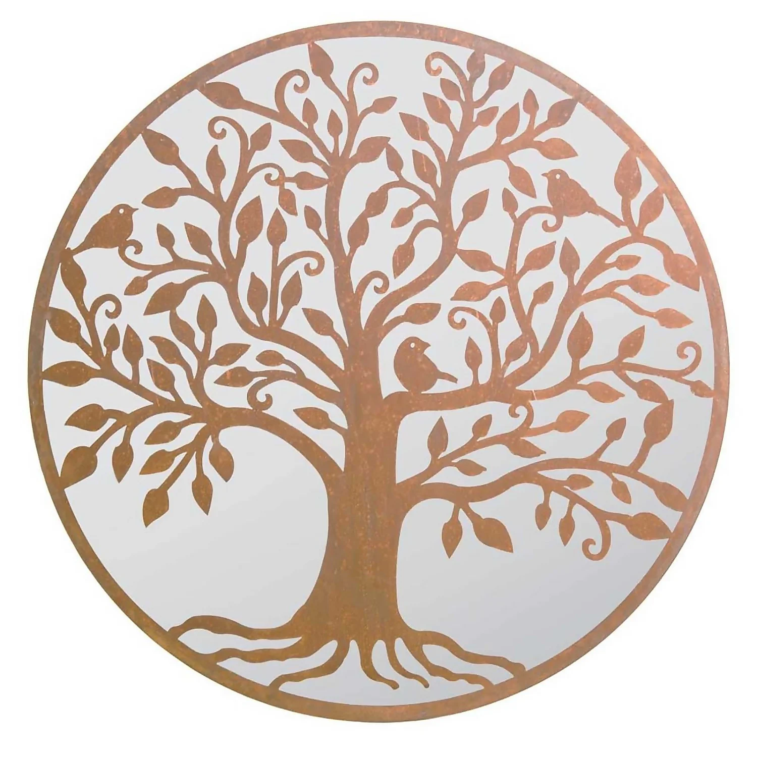 MirrorOutlet authentic garden mirror bird tree designed round wall mirror. This item is a real statement piece and it would be a true focal point for the garden it will truly impress any passer by. This mirror measures 3ft3, 100cm